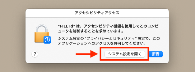 アクセシビリティの許可が未設定です。「システム設定を開く」をクリックし、表示された設定画面でFILL Idを許可してください。