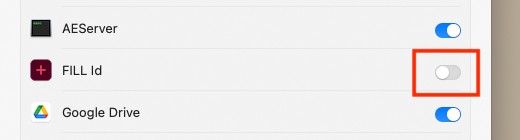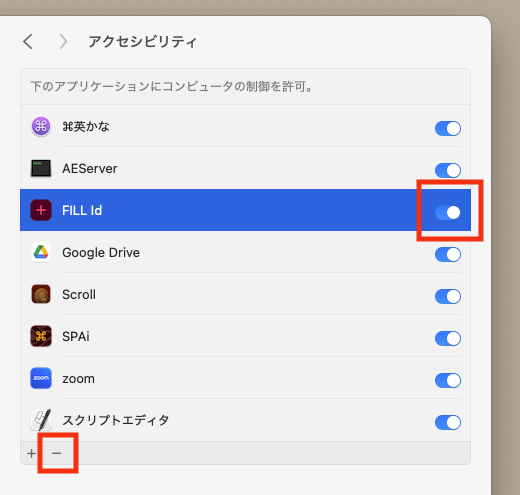設定画面でFILL Idの右側にあるスイッチがすでにONになっていた場合、一度FILL Idを削除して再設定が必要です。設定画面でFILL Idを選択し、「-」をクリックして削除します。FILL Idを終了し、再度起動してください。